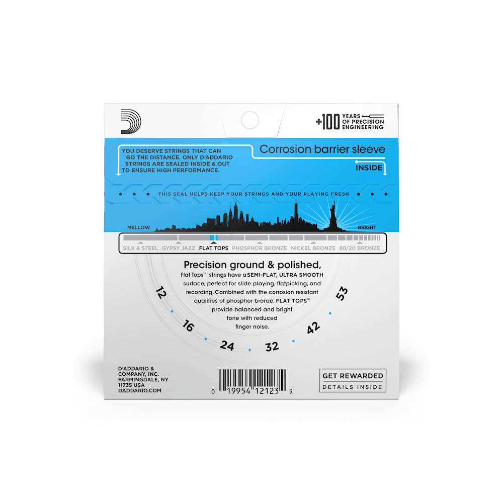 Струни D’Addario Flat Tops – це струни з традиційною круглою навивкой, які ретельно зашліфовані для отримання максимально рівною і гладкою поверхні. Це дозволяє отримати відчуття гри на струнах з плоскою обмоткою, при цьому не жертвуючи тональними характеристиками і сустейном, характерними для фосфористої бронзи. Flat Tops помітно зменшують призвуки від переміщення пальців і відрізняються глибоким насиченим звучанням.