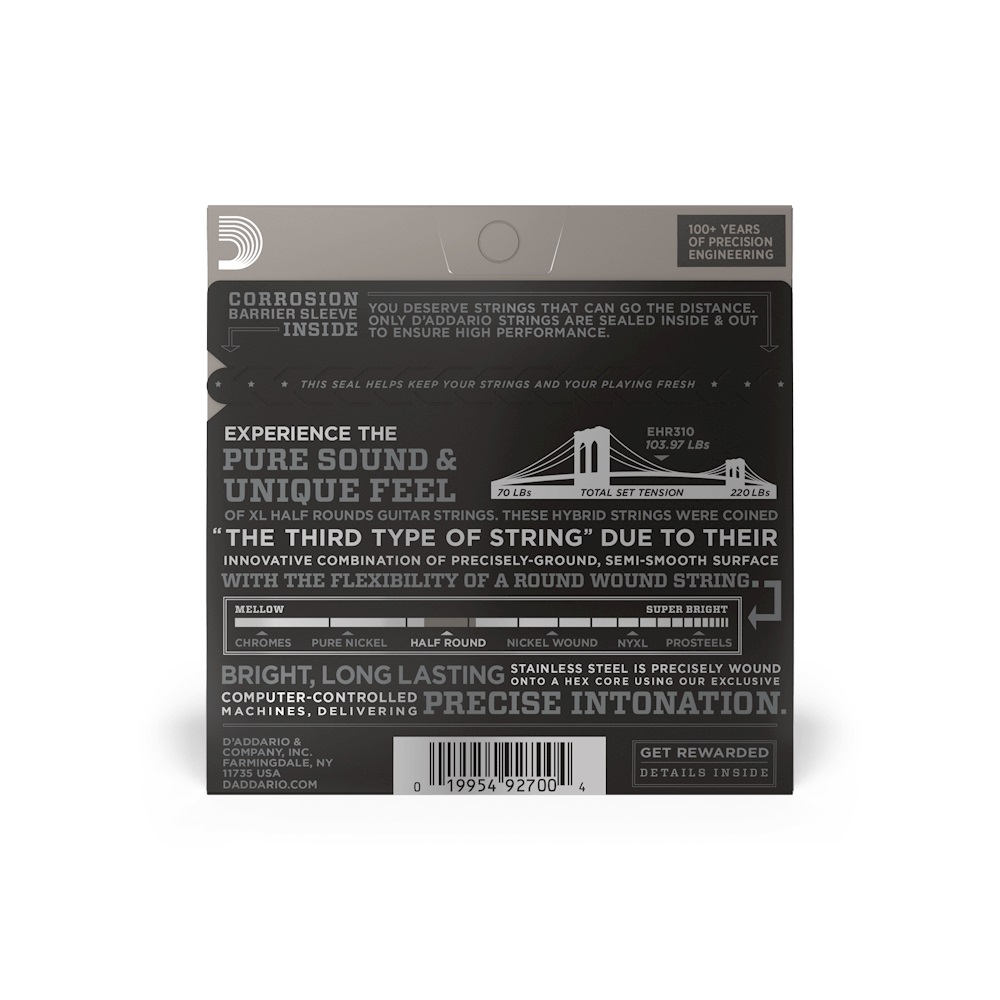 Обмотка струн D’Addario Half Round виготовлена з нержавіючої сталі і ретельно відшліфована до гладкої поверхні. Ексклюзивна технологія нагріву дозволяє цим струнам зберігати яскраве насичене звучання струн з круглою обмоткою.