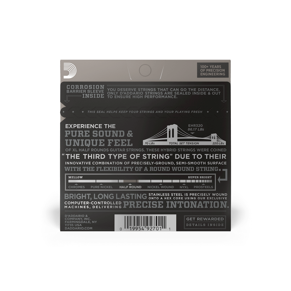 Обмотка струн D’Addario Half Round виготовлена з нержавіючої сталі і ретельно відшліфована до гладкої поверхні. Ексклюзивна технологія нагріву дозволяє цим струнам зберігати яскраве насичене звучання струн з круглою обмоткою.
