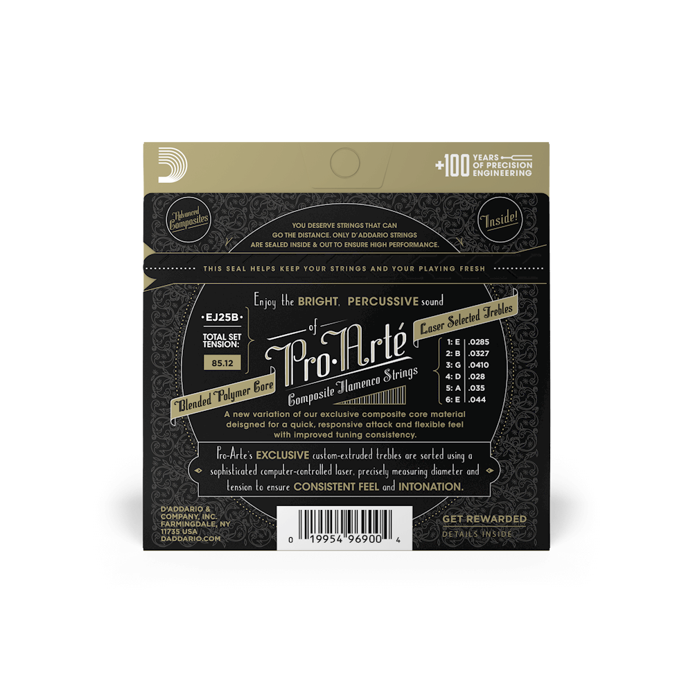 Струни Pro-Arte Flamenco Composites створені з використанням нового різновиду нашого ексклюзивного багатожильного витого сердечника, що дозволяє істотно поліпшити ‘живучість’ і стабільність ладу струн з обмоткою (порівняно з сердечником зі звичайного нейлону). Доповнений дискантовими струнами з чорного нейлону, цей набір ретельно випробовувався музикантами у всьому світі, для створення відчуття гнучкості і піддатливості, зберігаючи при цьому швидку атаку, необхідну для виконавців фламенко.