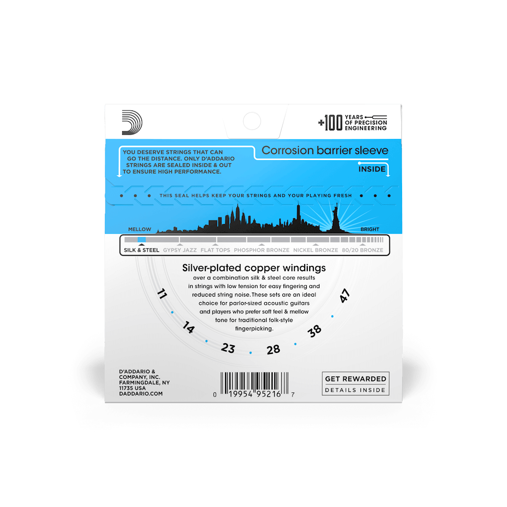 Струни D`Addario Silk & Steel в обмотці з посрібленою міддю мають шовк для зручності виконання пальцевих технік і більш м’якого звучання. Струни відмінно підходять для акустичних гітар зі зменшеною декою і класичних стилів.