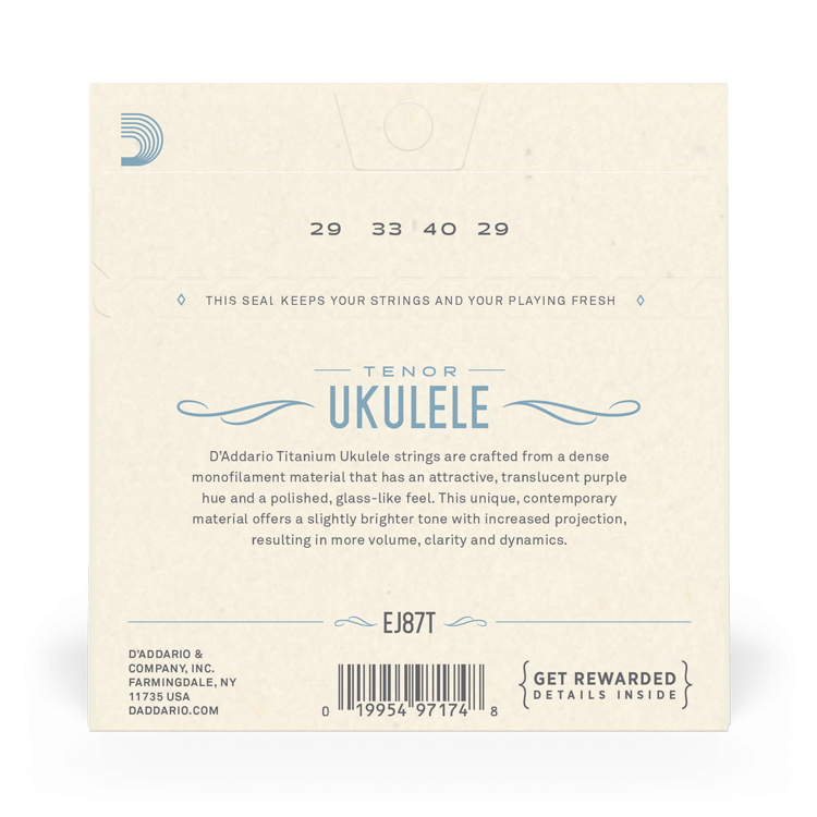 Струни EJ87T виготовлені з титанового моноволокна серії Pro-Arté та оптимізовані для тенорового GCEA ладу. Всі струни з набору виготовляються на власній вдосконаленій лінії екструзії моноволокна D’Addario, що була створена виключно для виробництва струн для музичних інструментів.