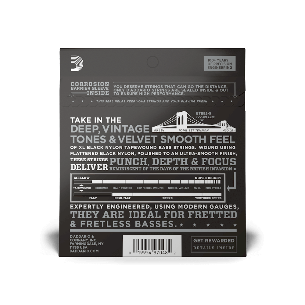 Створені для отримання глибокого і теплого звучання D’Addario XL Tapewound Bass використовують обмотку з плоского чорного нейлону, відполірованого до ультрагладкого покриття. Ці збалансовані і живучі струни спеціально створені для забезпечення оптимального натягу і підібрані по товщині, щоб ставати на стандартні басові поріжки і бриджі. Також їх можна використовувати і на безладових басах, щоб отримати класичний вінтажний саунд від контрабаса до традиційних струн з плоскою обмоткою.