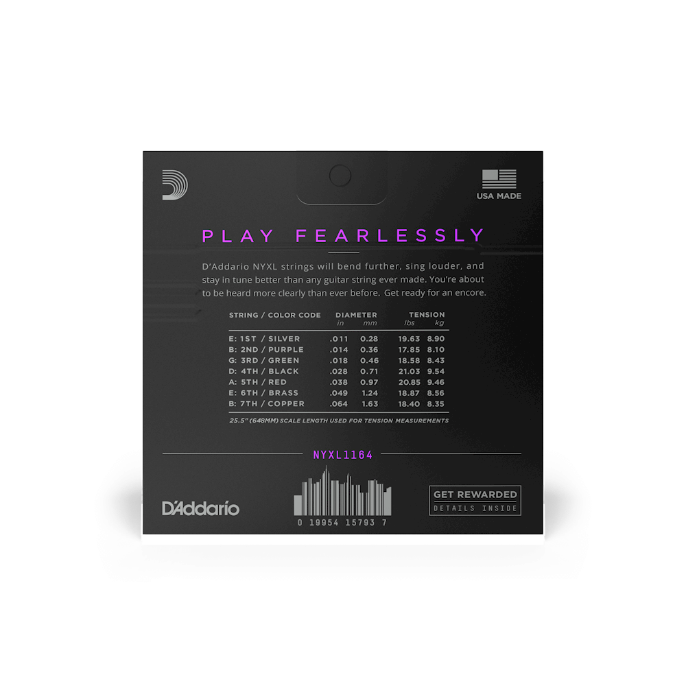 - NYXL1164 ідеально підходять для 7-струнних інструментів з мензурою 25.5′: .011, .014, .018, .028w, .038w, .049w, .064w