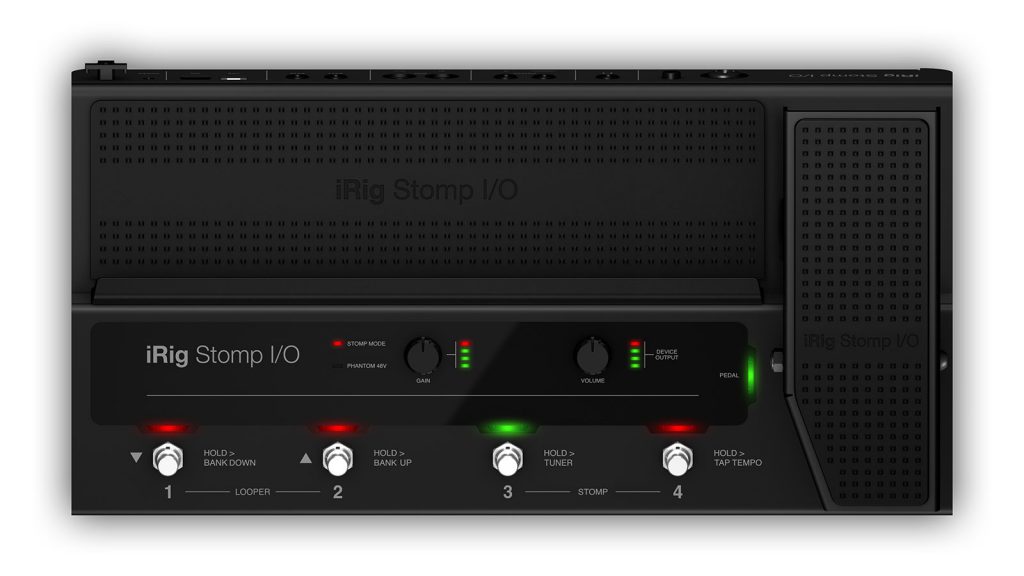 Міцний і надійний, але зручний в транспортуванні, iRig Stomp I/O оснащений чотирма вбудованими металевими кнопками, а також педаллю експресії з перемикачем зі світлодіодними індикаторами.